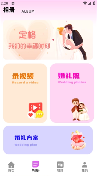 点击页面下方的“相册”按钮,就能看到录视频、婚礼照、婚礼方案等相关功能。