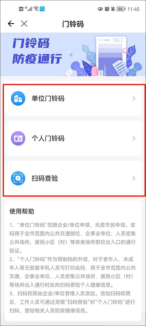 门铃码涵盖单位、个人、扫码三种使用方式,用户若想了解这三种方式的具体用法,可前往【使用帮助】中查看。