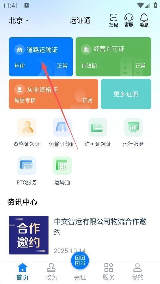 3、拿道路运输证照申领这件事来说,在首页点击“道路运输证”即可。