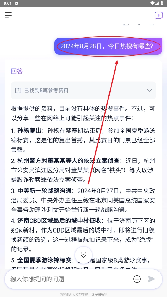 3、比如询问今日热搜有哪些,等待几秒钟,就能帮你秒回答,可以根据自己的需求进行使用。