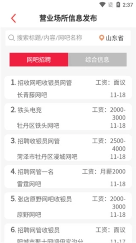 3、软件内设有营业场所信息发布中心,提供了大量网吧招聘岗位。