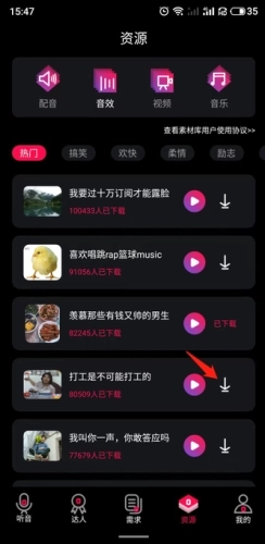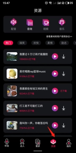 1、启动软件后,点击底部的“资源”选项,从中挑选要保存的音频。