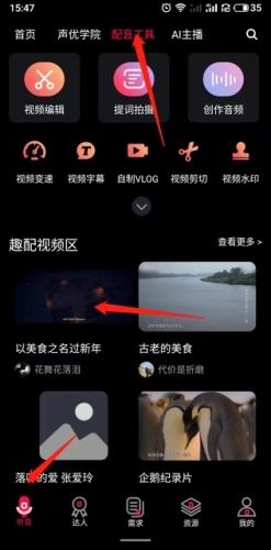 1、启动软件后,点击底部的“听音”选项,接着点击“配音工具”选项,然后挑选自己喜爱的视频。