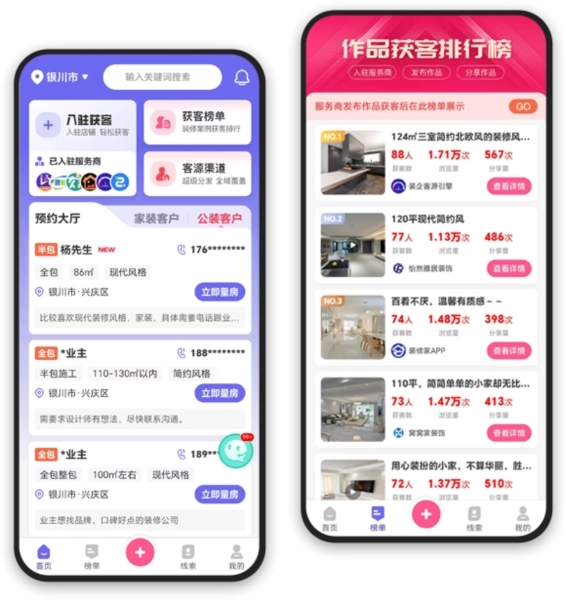 3、接单大厅:装修服务商在此拓展客源,家装、工装各类需求一应俱全。