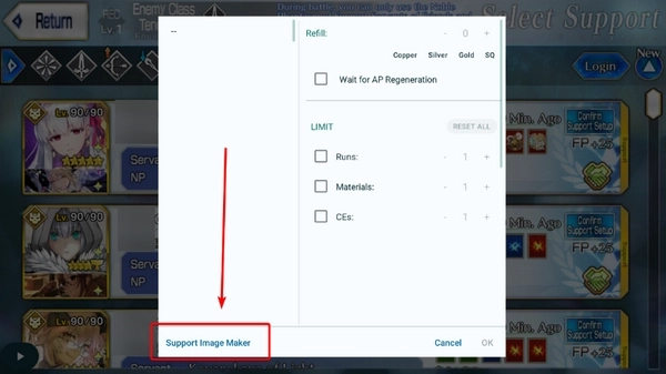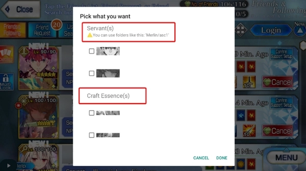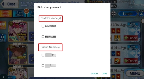 打开FGO。转到支持选择或朋友列表屏幕,并确保您想要的仆人/CE可见(重要的是整个仆人+CE区域可见)。