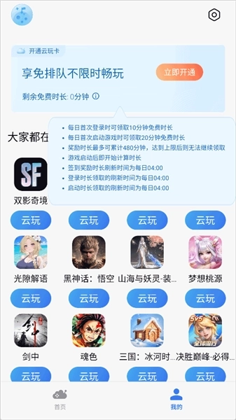 1、用户登录后即可获得免费时长,随后进入游戏界面,界面内的游戏无需另外付费就能游玩。