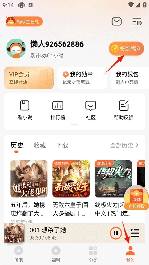 1、打开懒人畅听,点击我的-右上角签到福利;