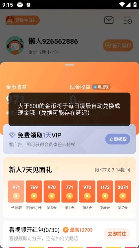 5、大于600的金币将会在每日凌晨自动兑换成现金;
