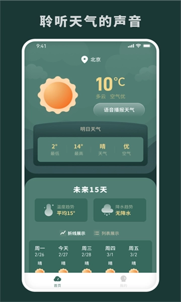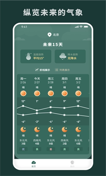 3、【未来15天的天气】观看天空,了解未来。在接下来的15天里,你可以随时掌握当地的天气趋势,防止天气突然变化。