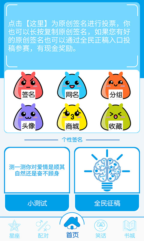 2.它提供一些有趣的小测试,用户通过测试可以自己原创签名并迅速投入使用,之后还可以推荐相应风格的头像及网名等,操作也非常简单。