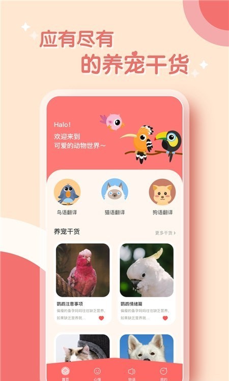 鹦鹉翻译器不仅能够为您提供专业的人宠翻译功能,可以为您一键将人语实时翻译给爱宠,通过录音宠物叫声,马上了解宠物表达的含义,此外,鹦鹉翻译器安卓版还会定时为您带来了海量养宠干货,让您掌握更多专业养宠技巧。