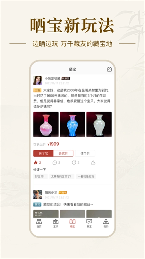 3、平台打造藏友圈提供社交服务,在这里用户可以发布动态与众多藏友交流收藏品,可以发布藏品图片请求专家鉴定真伪