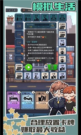 一款基于模拟的休闲游戏,丰富多彩的游戏场景,以及全新的游戏玩法给玩家带来了很多乐趣。游戏中,玩家需要安排好自己的日常生活,安排好自己做事情的时间。时间需要安排不同的娱乐套路来缓解你的疲劳,保证你的身心健康,出去玩交朋友。这款游戏体验还是很真实的,下面我们就一起来体验一下吧。