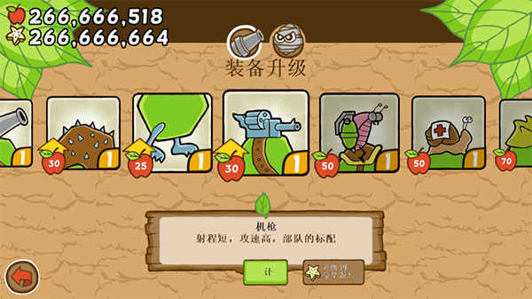 3、大炮:大炮的威力就是机枪无法比拟的了,不过攻击频率有所下降,同时还需要负担更多的树叶值来消耗。是中后期财力比拼的要点