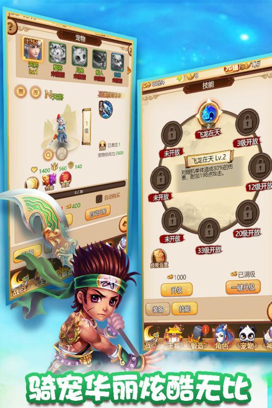 在游戏中,玩家可以抓捕各类宠物,它们可能是高高在上的天神,可能是流浪在外的山精野怪,也可能是镇压诸天的上古神兽。除了宠物还有美轮美奂的天女和仙君,漂亮是她们的代名词,绚丽四射的技能才能她们真正美的体现,她们将陪伴你一起走完这条取经路。除了这些,还有各色坐骑、炫酷翅膀、强力装备;还有兄弟一起努力建设的帮会地图,一起血战的帮会战,帮会妖怪,一起协助的帮会副本。更具趣味的宠物出战搭配,不同宠物不同技能不同天女和仙君,策略智力将在这里完美的体现,让你看到你的不凡之处。