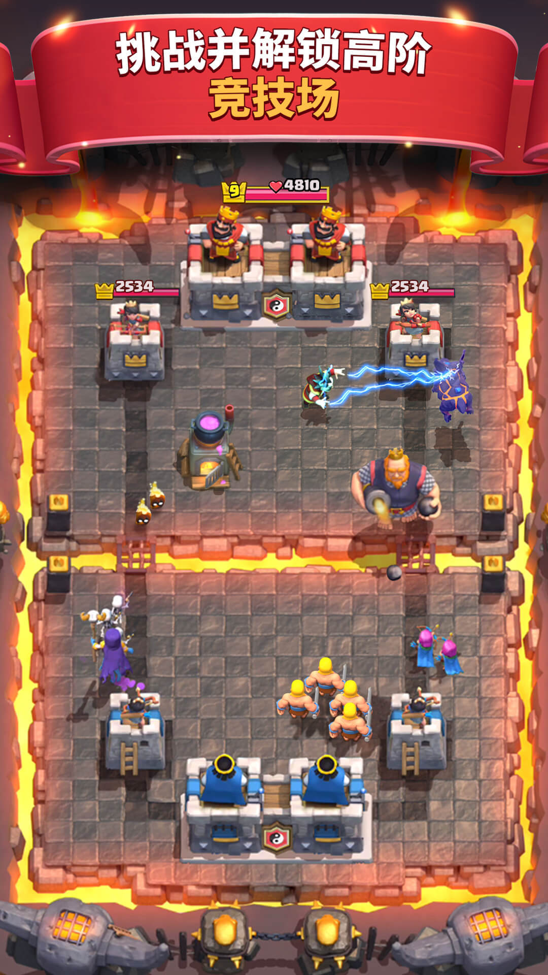 收集并升级数十张卡牌,其中有您熟悉并喜爱的部落冲突中的部队、法术和防御工事,以及多位皇室成员,如王子、骑士和飞龙宝宝等等。攻打敌军国王和塔楼上的公主们,击败对手并赢取奖杯、皇冠以及竞技场荣耀。组建部落,分享卡牌,打造属于自己的战斗圈子。