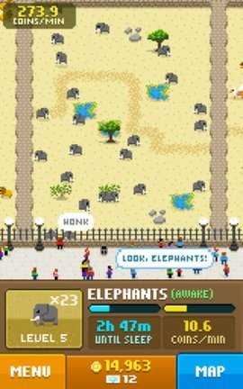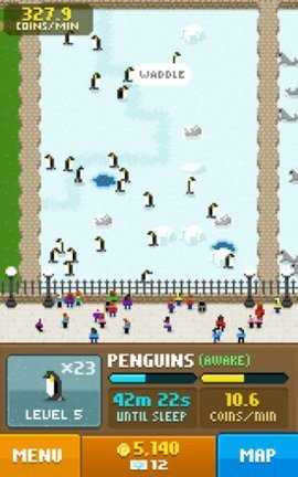 救到动物后,动物园就会为每一种动物都建造一个场地,随着游戏的进行,眼见小小的动物园越建越大,成为中型、大型、超大型动物园,喜悦和成就感不言而喻。每只萌萌的小动物都会带给我们收入,但需要休息,一旦睡着了就无法再盈利,直到你将其唤醒,这就迫使你没事儿的时候打开游戏点两下。而且每种动物的工作时间都是不一样的,随着同一种类型动物数量增加,还会升级,通过升级赚到的金币会增多,根据动物的稀有程度,动物们的等级上限也各不相同,将一种动物升至满级也会获得奖励。值得注意的是,神秘动物的工作时间是其他动物的数倍甚至更多,简直是天生的赚钱机器。不过这非常正常,现实世界中如果有哪家动物园能展出独角兽、狮鹫什么的,钱不要太好挣啊。总之,营救动物,在动物园展出,人们交钱观光,获得收入,扩建动物园,升级飞行器,去营救更多动物,挣更多钱……就是这样一个循环