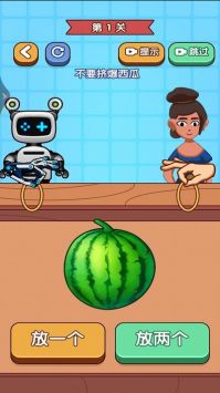 游戏玩法是用橡皮筋抓住西瓜。玩家与游戏中的机器人一起踏上各种突破关卡的冒险。