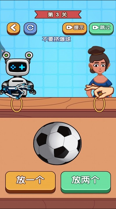 天天玩什么是一款休闲闯关游戏,不要挤爆球是唯一的目标,你可以选择放一个橡皮筋或者放两个,让机器人爆炸你就可以获得最后的胜利,顺利进入下一关了。