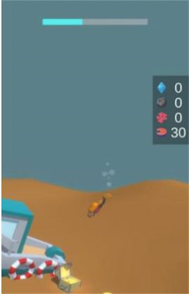 1、随意滑动屏幕控制潜水员在水下移动,探索各种矿物或宝藏,躲避鲨鱼的进攻。