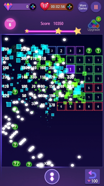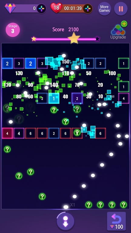 1.能够在这款游戏当中去发射更多的小球,并且能够不断的去攻打更多的霓虹砖块。