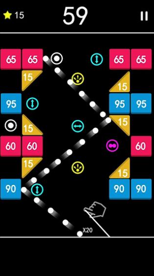 1.弹珠在方块之间是可以来回反弹的,最终能消除不同类型的方块。
