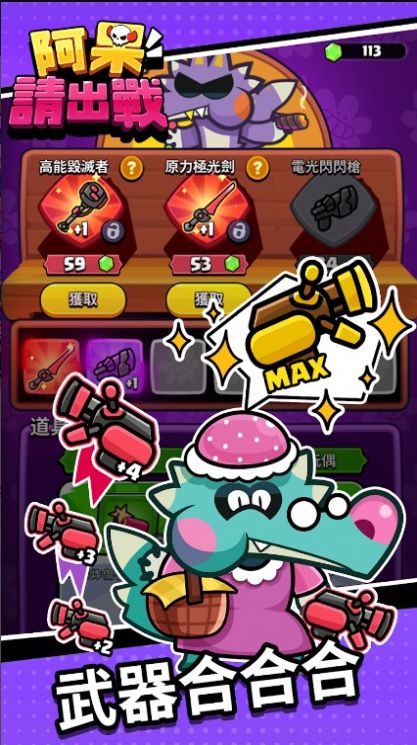 1.阿呆以更强大的姿态回归,为它提升战力,需要您通过一波波的妖潮,获得宝石来购买新武器;