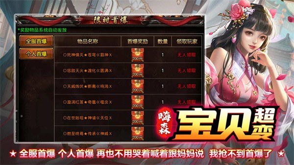 嗨森宝贝超超变是一款有着超多新手福利的经典超变版热血传奇手游,在新开的嗨森宝贝超超变游戏中,为玩家带来了可以无限光速切割的超燃战斗竞技。玩家可以通过技能和装备的不断升级,不断提升自己的战斗力。游戏中采用了超级变态的设置,让玩家能够感受到前所未有的刺激和挑战。