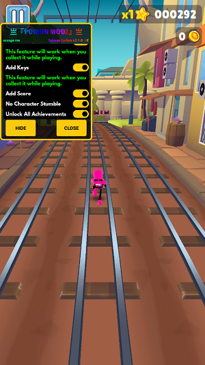 《地铁跑酷折翊公益版本无限金币》这款地铁跑酷游戏中的内容已经全部都是可以解锁的。不管是金币钻石还是钥匙,通通随便使用,而且玩家还可以通过游戏界面左上的菜单进行开启不同的功能,比如说无敌,那么就不用担心跑酷的时候被撞或者被或者火车拦住,直接就可以撞毁各种障碍物,畅通无阻。