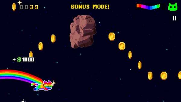 当然,作者在游戏中还是搞了很多有趣的地方,比如遇到狗,人,或者很多搞怪的物品,都会有特殊的效果,还是比较用心的,当然最让我喜欢的是,里面有个物品,吃了以后就可以用彩虹猫的形式,在金币的宇宙中穿梭,有点马里奥用树藤上天吃金币的味道。除此之外,还有一个个小段冲刺的道具,都让游戏有点炫酷的色彩。