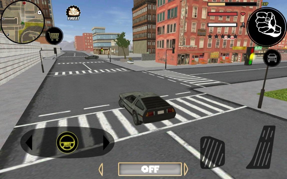2、每当角色的附近有车辆时,屏幕的左方会有一个汽车头的按钮,点击之后就会让角色就会抢夺车辆,操纵车辆的话在屏幕右下角有两个踏板,左边是删除的按钮,右边是油门,屏幕左下角会有一个类似方向盘的东西,是用来控制方向的,对汽车的操纵一定要好,因为这是我们快速获取金币的最好的办法。