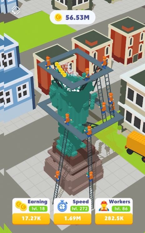 观看您的工人团队一砖一瓦地放松,从建筑物租金中收取更多的奖励!