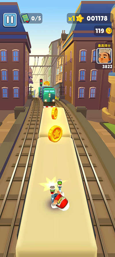 玩家经常遇到的一种情况。左右两路没有任何障碍,中路有5——6辆火车奔过来。为了能够把车上的金币吸收干净,这个时候就可以运用基础组合跳滚了,前提是不要玩得太很,稳一些较好,如果火车还没到达玩家下方,玩家就已经在半空中往下划那么就只有死翘翘了。如果玩家持有磁铁的话,建议普通跳跃就可以,磁铁会把漏掉的金币自动吸附给玩家。