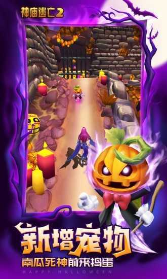 v5.8.0万圣狂欢趴开启!全球10亿人都在玩的经典跑酷游戏《神庙逃亡2》迎来万圣节版本,全新宠物、全新坐骑隆重登场。 新宠物“南瓜死神”,将南瓜灯与鬼怪元素完美融合!新形态坐骑“烈火战车”,告别动物坐骑,以摩托车姿态呼啸来袭!为烘托万圣节氛围,神秘的“幽灵河湾”地图免费开放体验;万圣节主题活动——南瓜灯收集赛开启,赢取超值奖励。 这个万圣节,越玩越上瘾! 更新内容: 万圣活动发出邀请! 1.新增宠物 南瓜死神前来捣蛋 2.新型坐骑 烈火战车呼啸来袭 3.幽灵河湾 万圣地图免费开放 4.万圣活动 南瓜灯收集赛开启