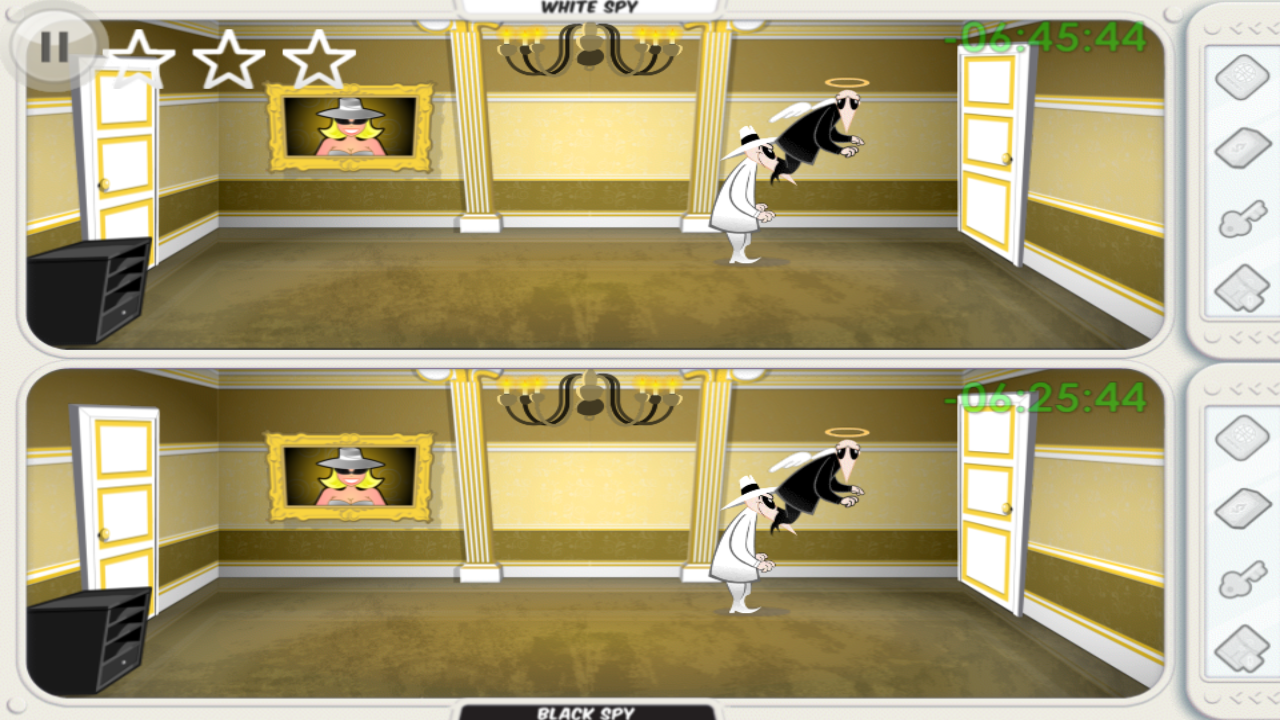 游戏的操作很简单,只需要通过点击即可完成移动和搜索。跟原作一样,安卓版本的游戏也采用了上下分屏的方式,玩家可以任意选择黑白间谍中的一名来进行游戏。玩家需要收集四样道具最终逃离大使馆。游戏开始时,这四样道具全部都隐藏在游戏场景中,玩家要做的就是在所有房间里点击进行搜索。