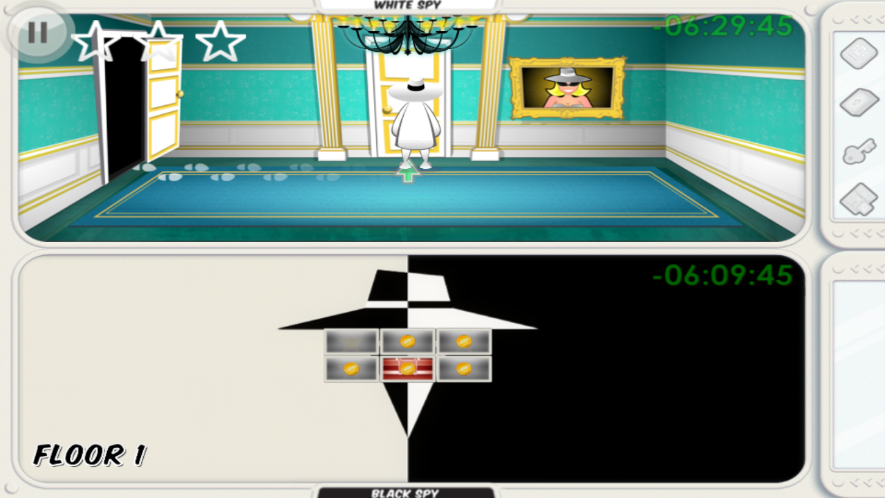 游戏在单人模式中共有24个关卡,随着关卡的深入,大使馆的规模也会越来越大,收集的难度也越来越高。除了四种必须的道具,房子里还隐藏着三颗星星,收集后获得的评价也会更高。另外如果两名间谍在同一个房间相遇,就会发生对战噢,靠近对方后点击屏幕上方三个按键就可以使用对应的方式进行攻击,把对方击倒后有一定几率抢夺他身上的道具。