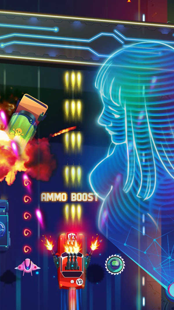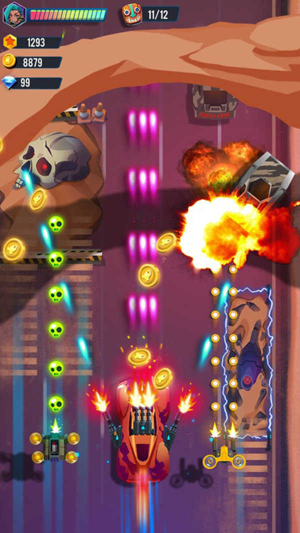 一边跳起来获取提升道具、加速、修理、分数加倍、吸金磁铁等各种小道具, 从而获取额外优势,横扫敌人和BOSS。