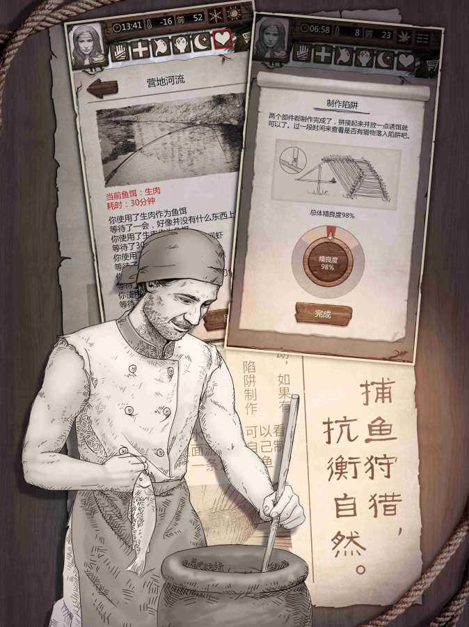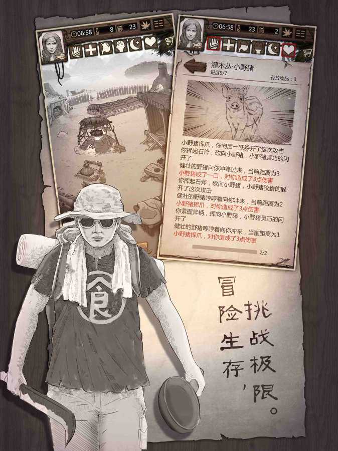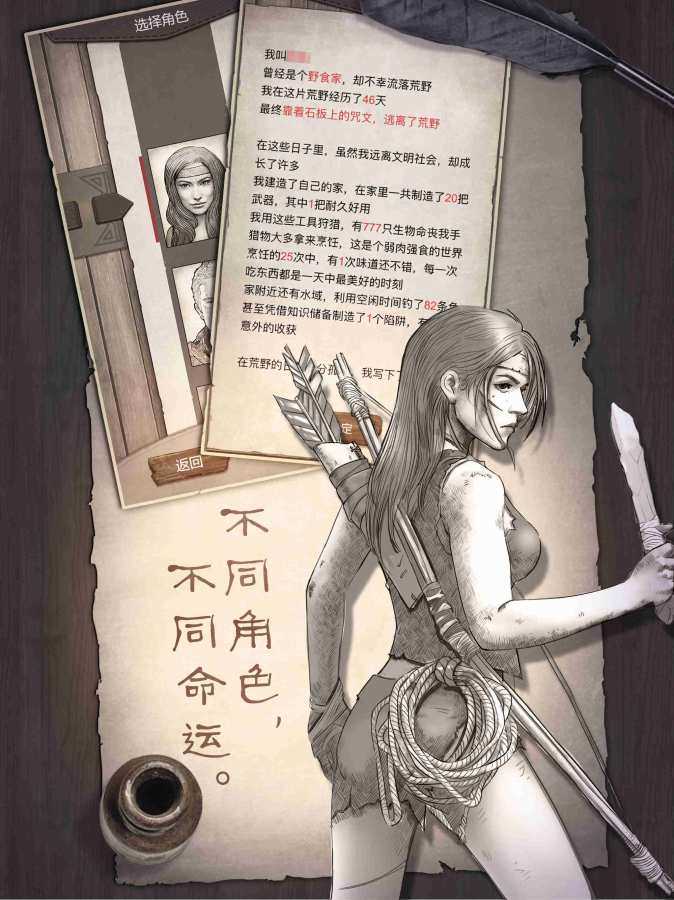荒野求生是一款手绘风高自由度文字类生存冒险游戏,全新的生存冒险玩法,玩家流落荒岛展开一场艰难的求生之路,在各种恶劣的野外生存环境下生存下来,培养你的生存技巧,制作食物建造房屋和野兽进行战斗,玩家可以选择不同的角色,每一个角色的初始加成都各有不同,决定了你以后的生存方向。