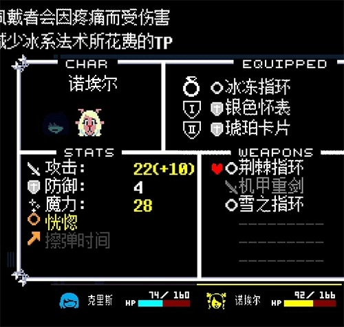 如上图所示,当我们的TP积攒到100时,诺艾尔的[魔法]里就会出现“雪葬”。此时,即便她劝阻,我们也直接对鸟哥使用“雪葬”。(一定要用“雪葬”,因为冰震术没办法将鸟哥冰冻。要是你发现使用“雪葬”对付鸟哥需要200TP ,听我的,肯定是你忘记佩戴荆棘指环了。)