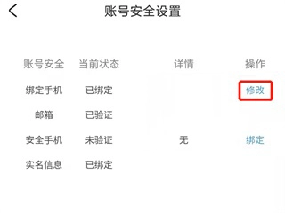 进入账号安全设置页面后,点击绑定手机右侧的修改按钮。