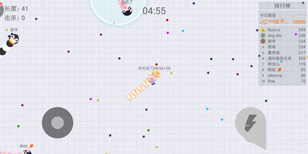 在游戏界面里,玩家左手的操作圈用于控制移动和调整方位,右手区域则负责加速技能的启用与关闭。使用加速技能会消耗小蛇的部分长度,因此要留意对该技能释放时机的把控。