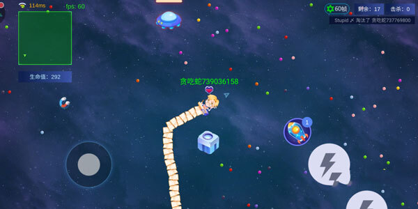 在地图里也会碰到其他玩家操控的小蛇,要是头部撞到别的小蛇同样会死亡。想要消灭敌方小蛇,得用自己的身体去撞击它们,消灭之后还能吃掉敌蛇掉落的豆子,以此来让自己的长度变长。