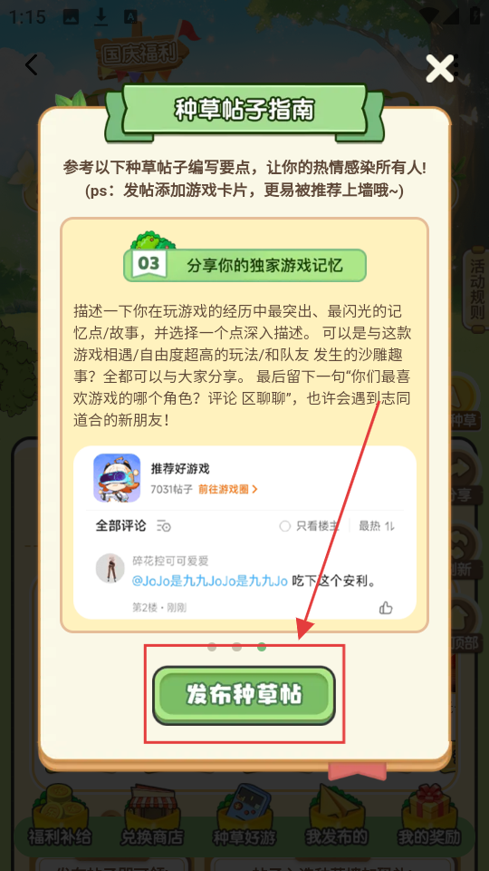 3、在“种草吧!玩家”活动页面,要是想知道种草帖子的撰写方法,点击【种草帖子指南】选项,即可查看指南内容。