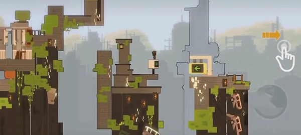 游戏刚开始时以教学引导为主,难度设置得比较低。等玩家熟练掌握基础的跳跃动作后,就会接触到第一个重要的机制:通过点击屏幕并滑动来调整视角,改变当前看到的画面方向,进而借助视觉上的错觉开辟出全新的路径。这一设计是游戏的核心玩法之一,充满了巧妙的构思。