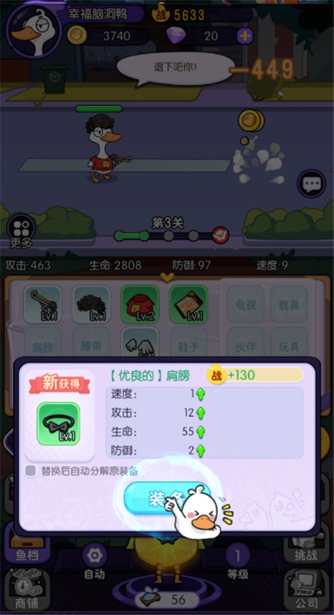 1、在游戏的初始阶段,你仅拥有一只小鸭子,通过持续投喂的方式,能够获取大量的装备与道具。