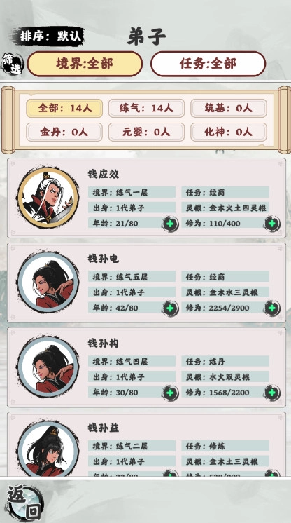 多样化的角色设定:玩家需负责管理门下弟子,每位弟子都具备独特的技能与性格特质,因此要为他们量身定制不同的培养方案。