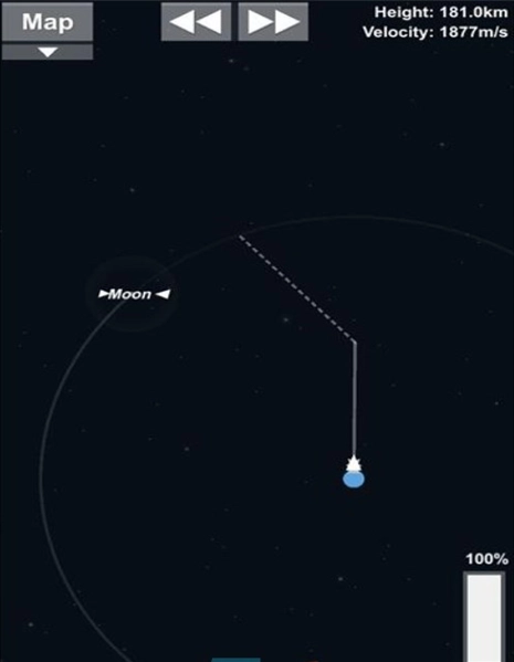 4、打开地图查看火箭的轨迹是否接近月球轨道,并将用完的四个氮气桶分离出去。