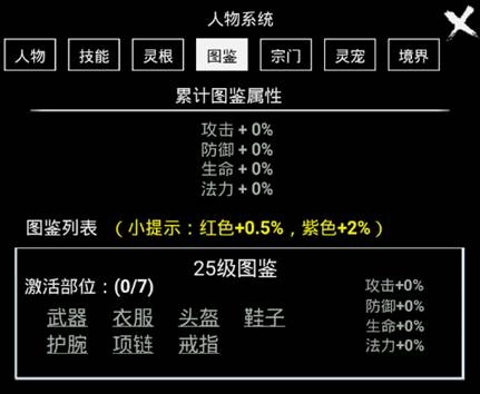 只有将7个部位全部激活,方可激活图鉴属性。每级图鉴都会增加攻击、防御、生命、法力这四维属性,其中红色图鉴属性提升0.5%,紫色图鉴属性提升2% 。