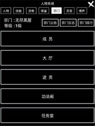 人物面板涵盖人物属性、技能、灵根、图鉴、宗门、宠物、境界这七个部分。