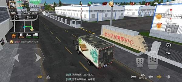 进入《卡车人生》正版游戏后,右侧界面依次显示订单、接收和完成任务的选项;右侧操作区域用于控制车辆的加速与减速,左侧操作区域则负责调整行驶方向;右下角的小眼睛图标具备自动回正视角的功能。